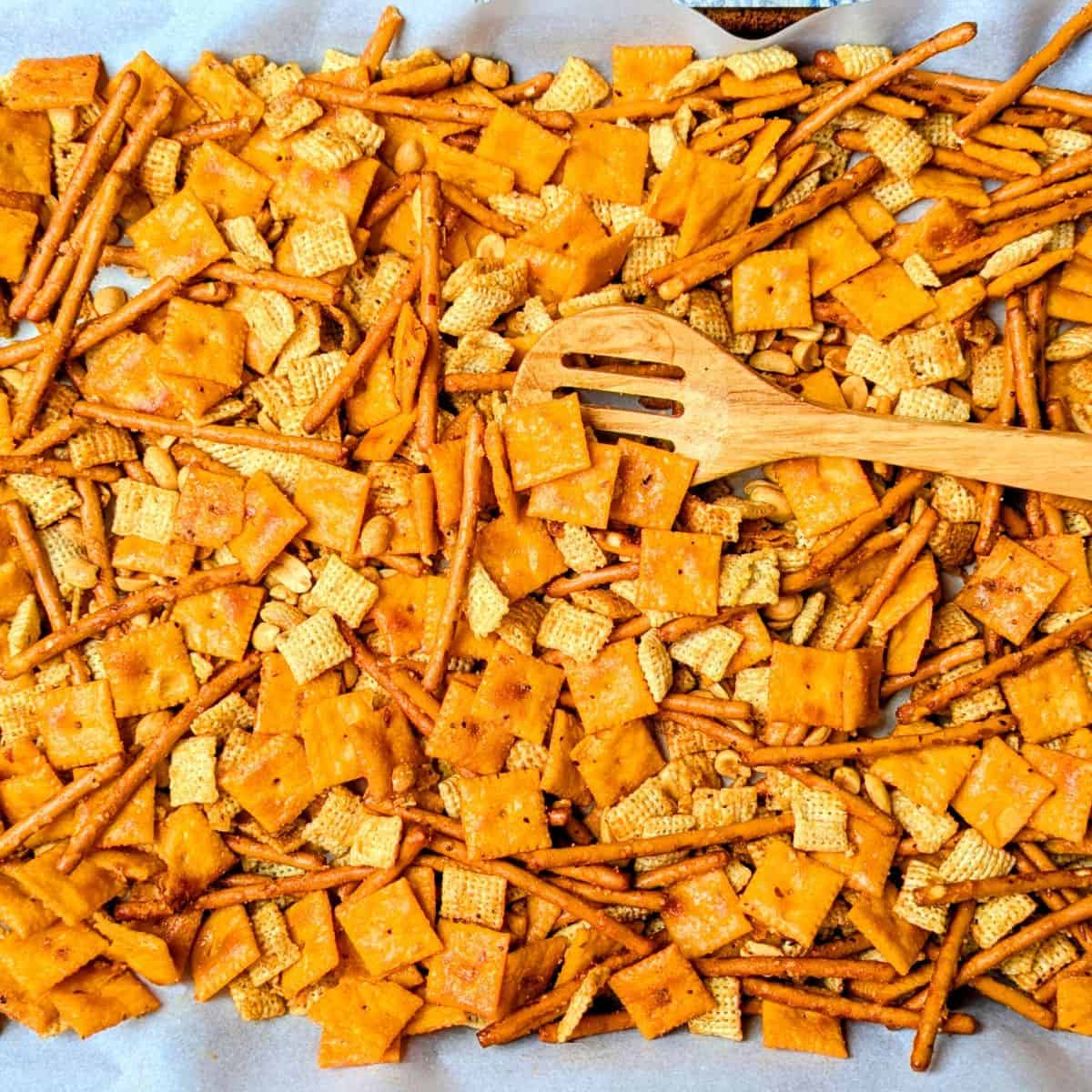 - Allow the snack to cool on the pan for about 10 minutes, then transfer to a serving bowl or container.