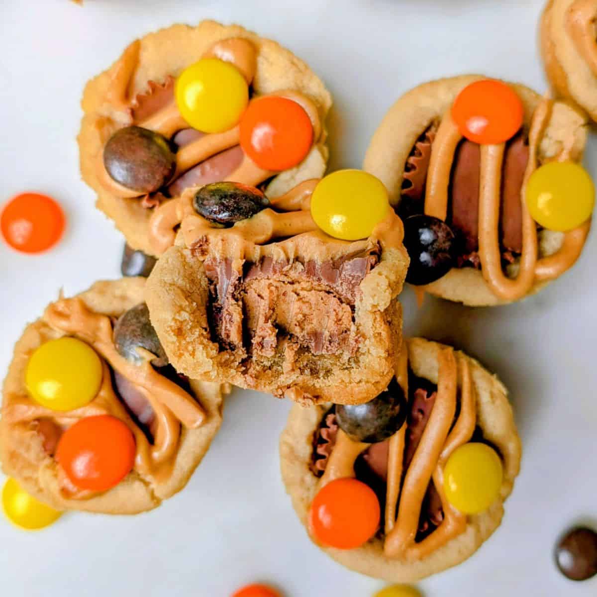 - Step 4: This step is optional, but highly recommended. Drizzle warm peanut butter on top and gently press on Reese's pieces to take these peanut butter cup cookies to the next level.